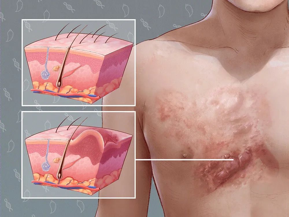 皮肤损伤后经历炎症期→增生期→重塑期,成纤维细胞过度活跃会导致胶原沉积失衡,形成凸起疤痕。