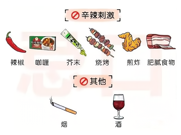 • 绝对避免:辛辣食物(辣椒、花椒)、酒精、油腻食物(油炸食品)。