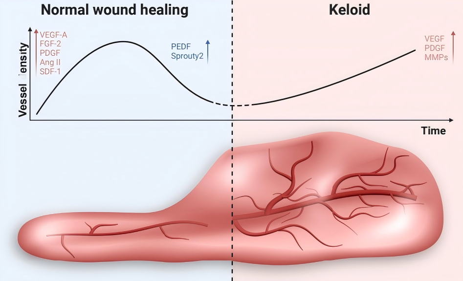 研究指出,瘢痕疙瘩的血管分布呈现空间异质性:周边区域血管密度显著高于中心区,且血管基底膜破碎化导致通透性增加。这种异常与促血管生成因子(如VEGF、PDGF)的持续高表达及抗血管生成因子(如endostatin)的抑制密切相关。