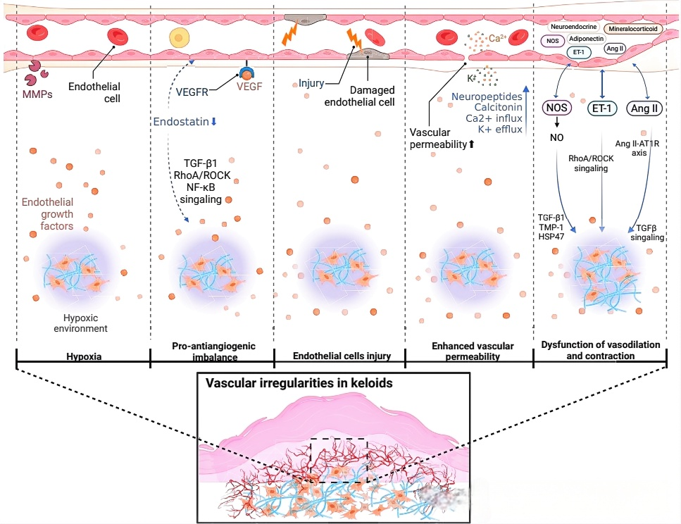 本文由温俊贤等学者发表于Journal of Investigative Dermatology,系统性地重新审视了瘢痕疙瘩的发病机制,创新性地将血管功能失调和内皮功能障碍置于研究焦点。传统研究多集中于成纤维细胞过度增殖与细胞外基质沉积,而本文通过整合单细胞RNA测序、空间转录组学等新技术证据,揭示了血管异常在瘢痕疙瘩形成中的核心地位,为这一难治性疾病的治疗策略提供了新视角。