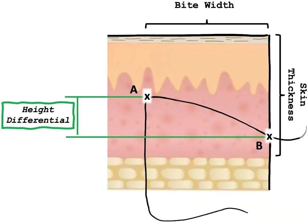 真皮缝合高度差,它指的是在一侧伤口,缝合线在真皮层内穿行的路径中,距离切口最远点(称为“咬合宽度”)与缝线出口点之间的垂直距离。简单来说,这个“高度差”就像一个杠杆支点:高度差越大,伤口边缘越容易外翻;高度差越小甚至为负,则越容易内翻。我们医生在缝合时通过控制进针角度、深度和手腕的旋转,精细地调控这个高度差,从而实现理想的伤口对合效果。