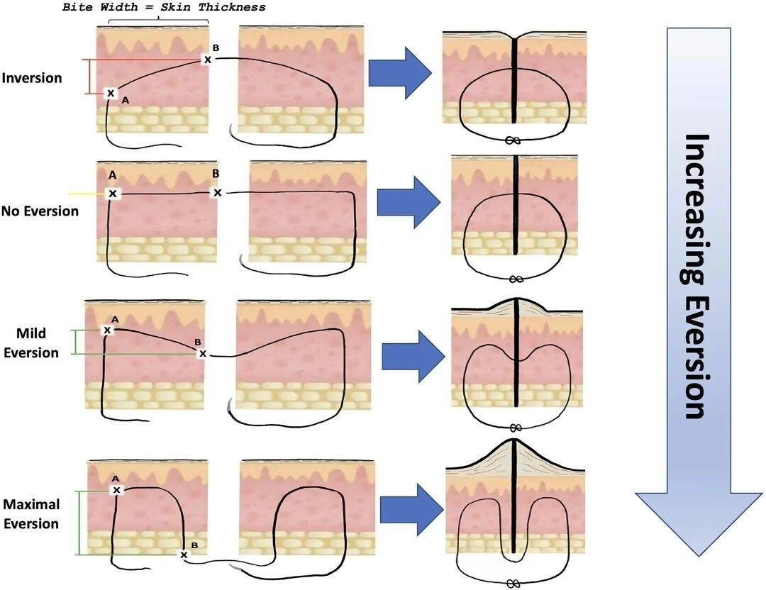 理解这一机制后,医生们就不再需要死记硬背各种缝合技术的名称和适应症(比如“这里必须用后退式缝合”)。无论采取的是常见的埋线缝合、垂直褥式缝合,还是其他改良方法,其根本原理都是通过创造适当的“高度差”来实现外翻。